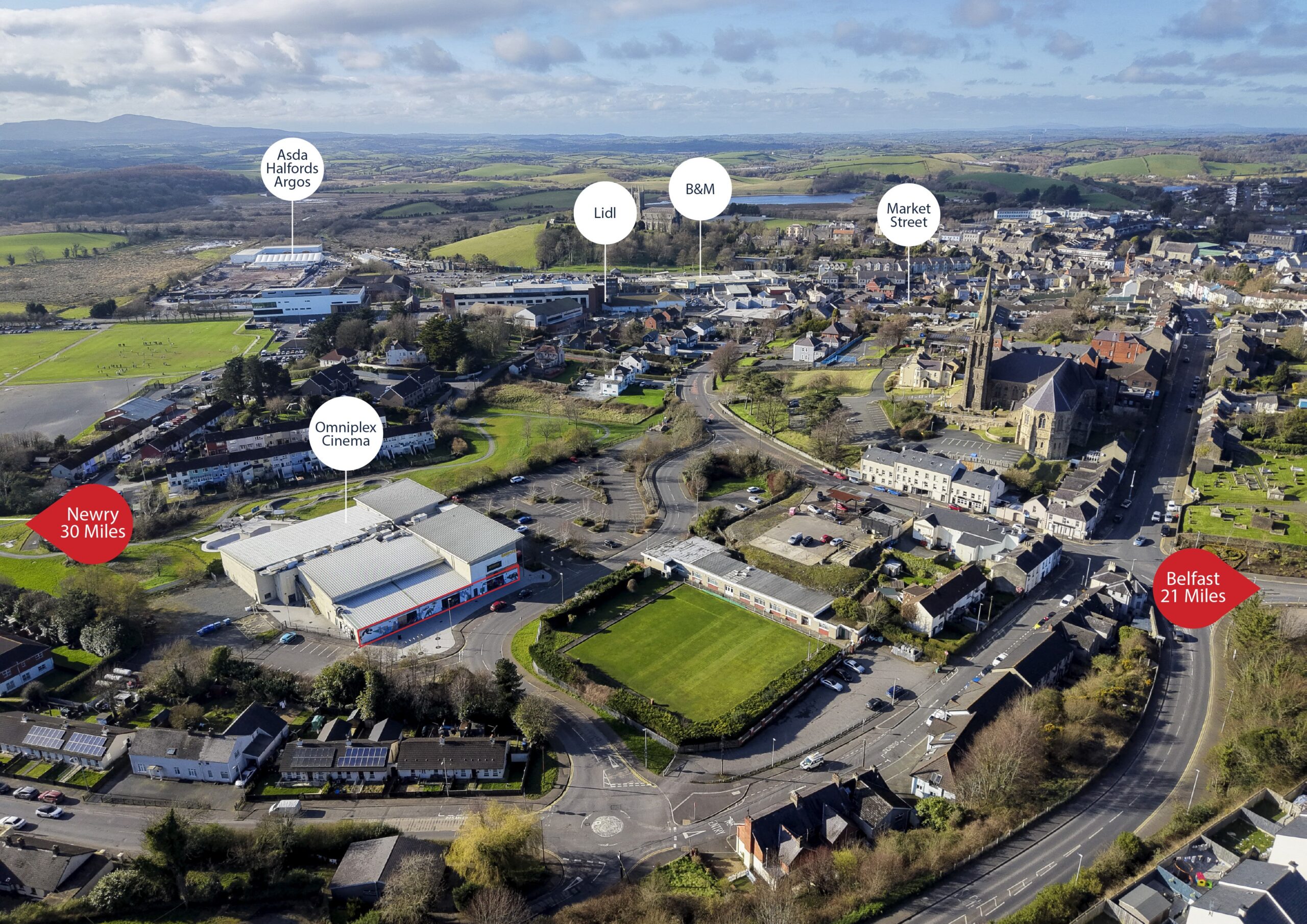 Located c.21 miles south-east of Belfast, the town acts as a key hub within the Newry, Mourne and Down District Council area and benefits from strong connectivity to Belfast.